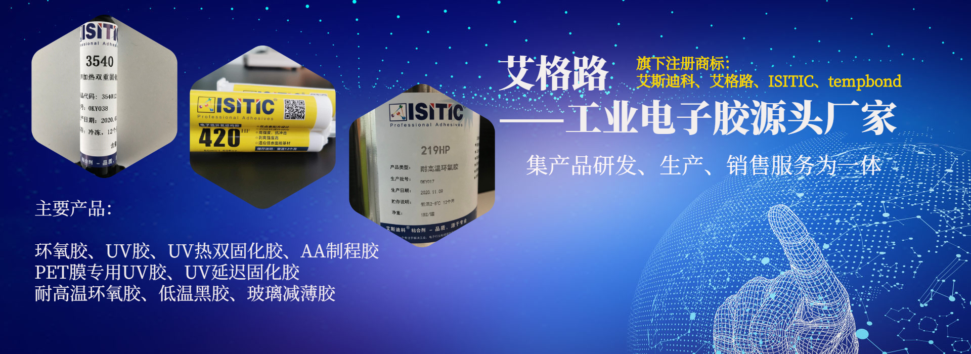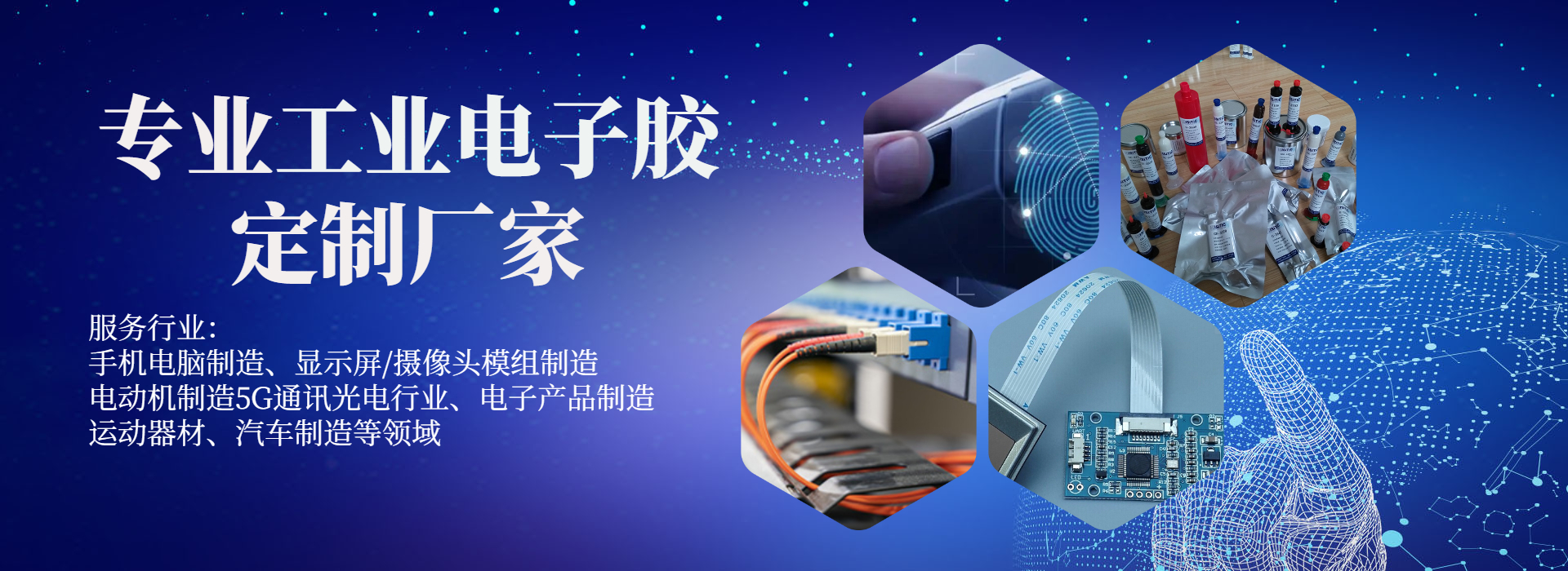 為客戶提供環(huán)氧膠、UV膠、臨時(shí)粘接膠、UV加熱雙固化膠、丙烯酸結(jié)構(gòu)膠等工業(yè)電子用膠解決方案